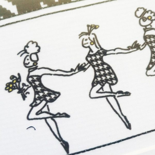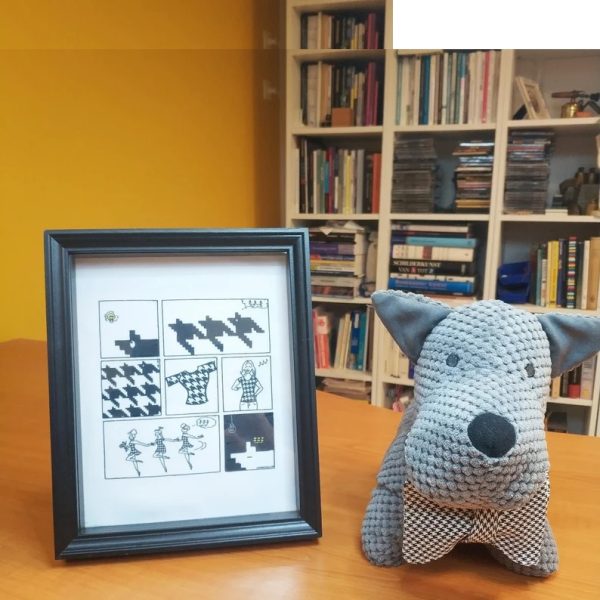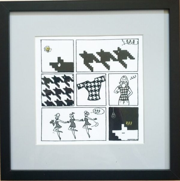 Math is fun, as shown by this Comic Mathematical Art Work. The comic strip is printed and transferred to fabric by sublimation printing. The borders of the panels are printed and top-stitched. The art work is in a wooden frame (choose natural beige or black), behind a passe-partout and glass. The story is about translations and symmetry in fashion; this pattern is known as Pied-de-poule (houndstooth). Note the meaning of the last panel: it is not only about closure of the story, it also refers to the foreground-background symmetry of the pied-the-poule pattern.